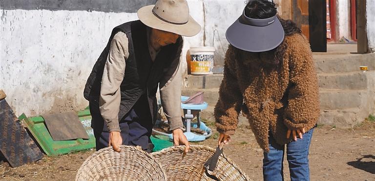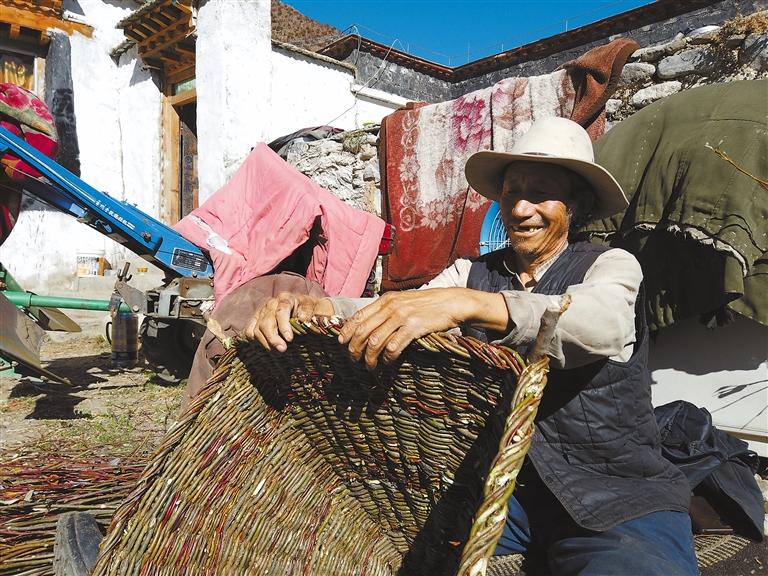 在墨竹工卡縣扎雪鄉(xiāng)格老窩村,記者走進(jìn)阿若家的小院。院內(nèi),堆積的柳條旁是忙碌的阿若,他的手指在柳條間穿梭,一個個柳條筐子逐漸成形。