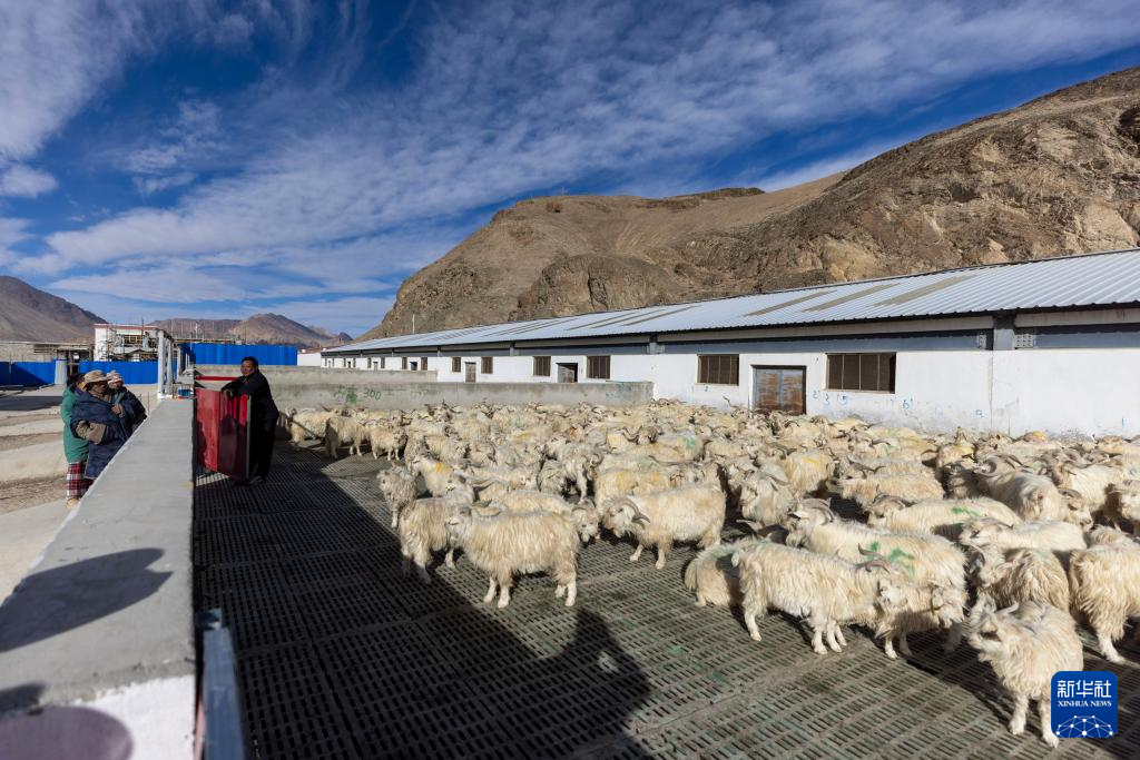 日土縣白絨山羊原種場(chǎng)的職工在照看良種羊(11月16日攝)。新華社記者 姜帆 攝 ??