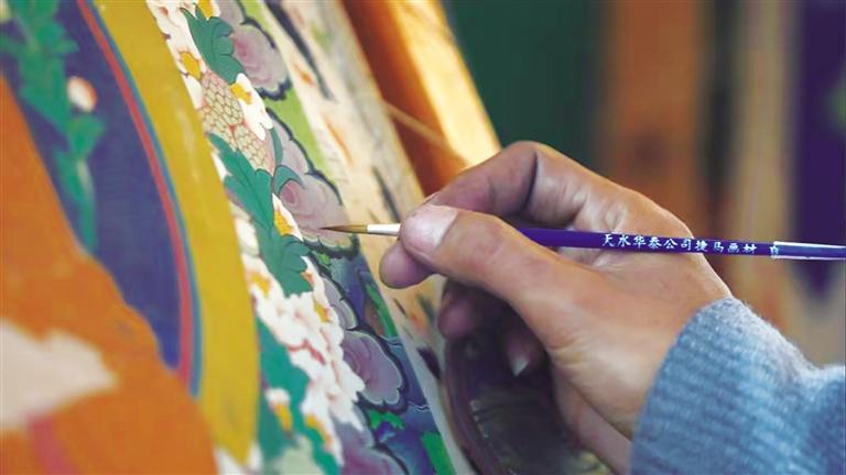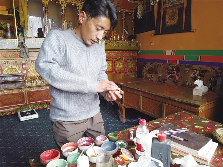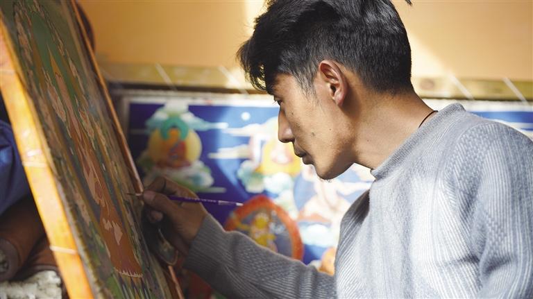 屋內(nèi),是他伏案繪制唐卡的專注身影;身旁,是父母欣慰的目光與陪伴?!白詮膶W(xué)會了唐卡繪畫后,我一直在拉薩就業(yè)謀生,但由于家里有年邁的父母需要照顧,我就回到家里一邊照顧父母,一邊繪畫定制的唐卡。這樣不僅有穩(wěn)定的收入,還能像其他人一樣靠自己的雙手過上幸福的生活。”尼瑪次仁激動地告訴記者,他的話語中充滿了對生活的感恩和對未來的信心。