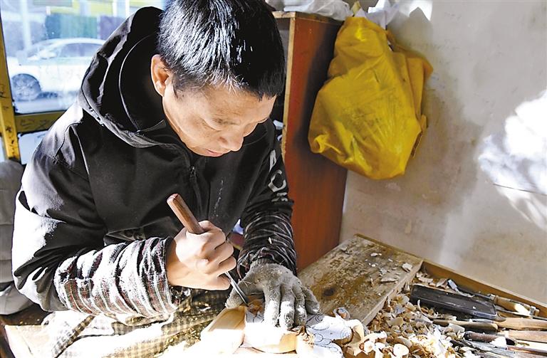 來(lái)自林周的多吉正在位于城關(guān)區(qū)內(nèi)的木雕工作室學(xué)習(xí)木雕技藝。記者 曲珍 攝