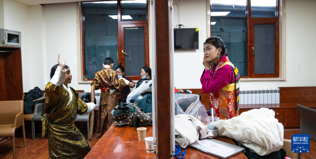 小演員在準(zhǔn)備演出舞臺(tái)劇藏戲《頓月頓珠》(2月11日攝)。新華社記者 丁增尼達(dá) 攝??