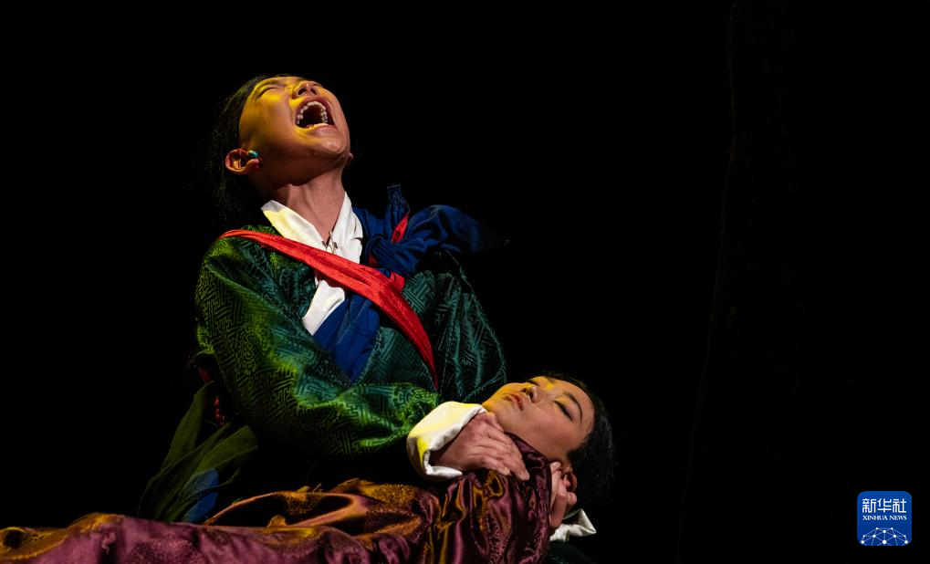?西藏首部少兒舞臺(tái)劇藏戲《頓月頓珠》演出現(xiàn)場(chǎng);羅桑朗覺(jué)(右)飾演“頓月”,旦增夢(mèng)朗(左)飾演“頓珠”(2月11日攝)。新華社記者 丁增尼達(dá) 攝?