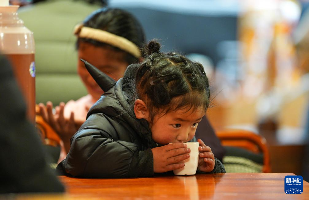 小顧客在“牧人寶庫(kù)”藏式茶館喝酥油茶(2月13日攝)。新華社記者 晉美多吉 攝?