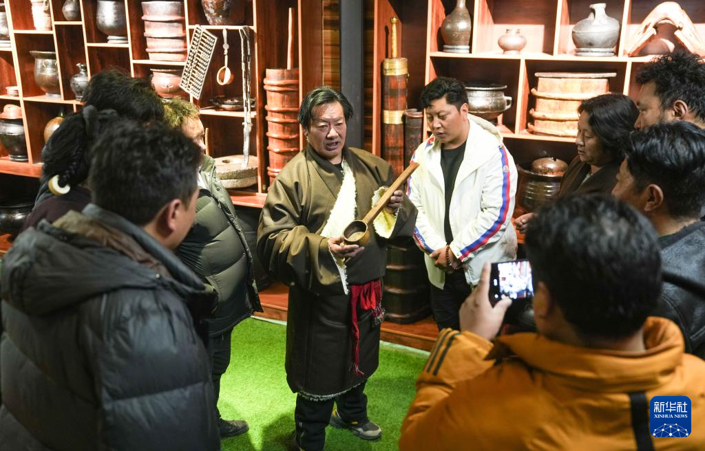 當(dāng)?shù)孛袼讓<邑暡悸逋ㄖ凶螅┰凇澳寥藢殠?kù)”藏式茶館給顧客講解館藏物件(2月13日攝)。新華社記者 晉美多吉 攝