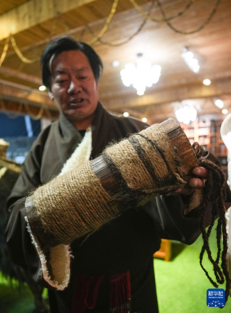 “牧人寶庫(kù)”藏式茶館主人珠珠演示紡羊毛線用的工具(2月13日攝)。新華社記者 晉美多吉 攝