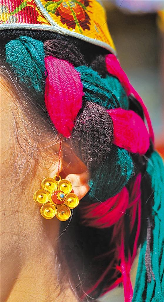 女士們的服飾則更加絢麗多彩。她們大多穿著黑色氆氌藏袍,系著彩虹條紋的圍裙“邦典”,既顯得端莊得體,又不失女性柔美。她們佩戴的耳環(huán)、項(xiàng)鏈、手鐲、戒指等飾物雖然簡單,但卻淡雅樸素,與高原的自然風(fēng)光相得益彰。特別值得一提的是,墨竹工卡縣的女性喜愛佩戴花朵形耳飾,與她們所戴的帽子“朗霞”形成了完美的搭配。