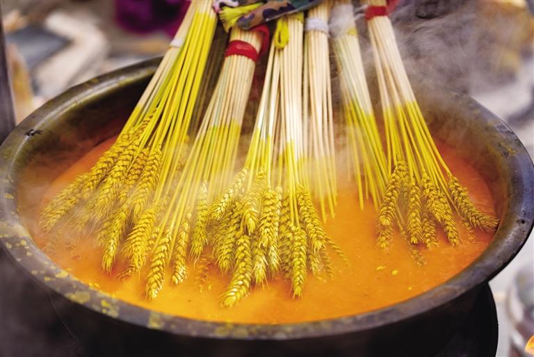從金黃到色彩斑斕,“羅薩梅朵”的制作需要經(jīng)過收割、曬干、上色等數(shù)道工序,這是桑木村村民傳承至今的手藝。熱氣騰騰的顏料鍋旁,年輕的媳婦正在煮顏料;曬干的“羅薩梅朵”堆在一旁,一位奶奶和她的孫子正在有序捆綁。廣場上,年齡最大的村民近70歲,最小的12歲,年輕人從老一輩手中接過了文化傳承的接力棒。