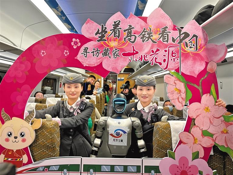 圖為拉林鐵路復(fù)興號動車組乘務(wù)員與機(jī)器人多吉合影。 記者 文鳳 通訊員 馬生明 攝