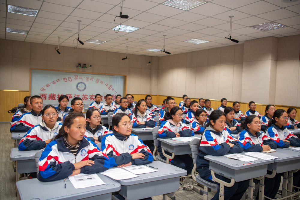 4月11日,拉薩江蘇實(shí)驗(yàn)中學(xué)的學(xué)生在認(rèn)真聽江蘇省如東高級中學(xué)的宣講。新華網(wǎng) 旦增努布 攝