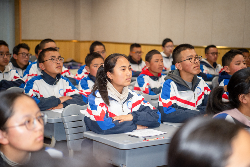 4月11日,拉薩江蘇實(shí)驗(yàn)中學(xué)的學(xué)生在認(rèn)真聽江蘇省如東高級中學(xué)的宣講。新華網(wǎng) 旦增努布 攝?