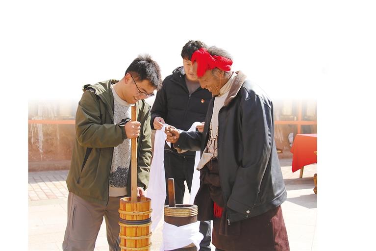 圖為昌都市芒康縣洛尼鄉(xiāng)干部學(xué)習(xí)酥油茶制作。