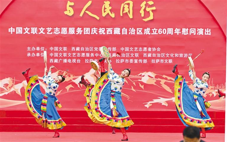 5月23日,在中國文藝志愿者服務日到來之際,由中國文聯(lián)、西藏自治區(qū)黨委宣傳部、中國文藝志愿者協(xié)會共同主辦的“與人民同行”慰問演出在西藏會展中心廣場隆重舉行。這場慶祝西藏自治區(qū)成立60周年的文藝盛宴,在歌舞《鼓舞西藏》激昂的節(jié)奏中拉開帷幕。