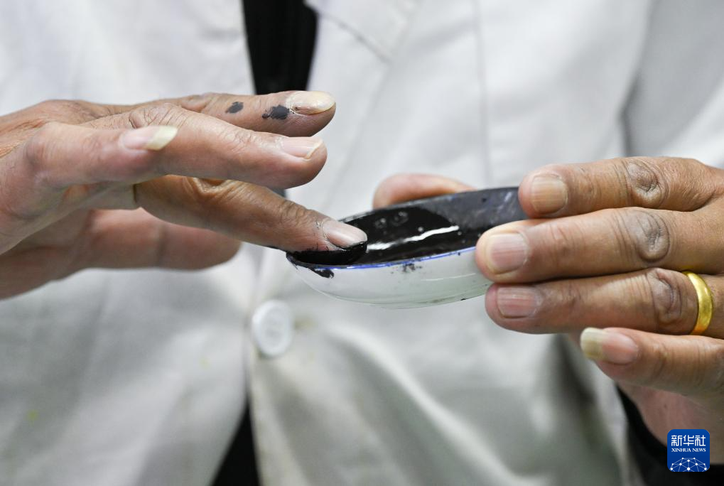 布達(dá)拉宮貝葉經(jīng)實(shí)驗(yàn)性修復(fù)小組實(shí)驗(yàn)室工作人員對(duì)用于貝葉修復(fù)的顏料進(jìn)行研磨處理(5月25日攝)。新華社記者 李賀 攝