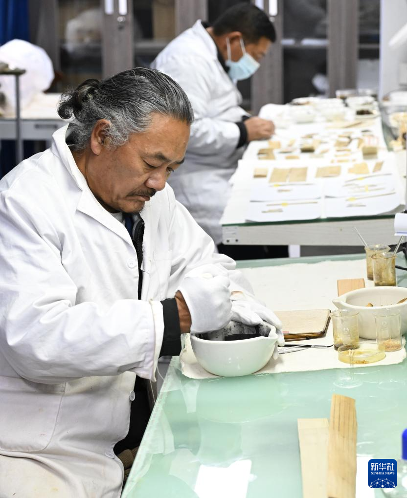 布達(dá)拉宮貝葉經(jīng)實(shí)驗(yàn)性修復(fù)小組實(shí)驗(yàn)室工作人員對(duì)用于貝葉修復(fù)的顏料進(jìn)行研磨處理(5月25日攝)。新華社記者 旦增尼瑪曲珠 攝 ??