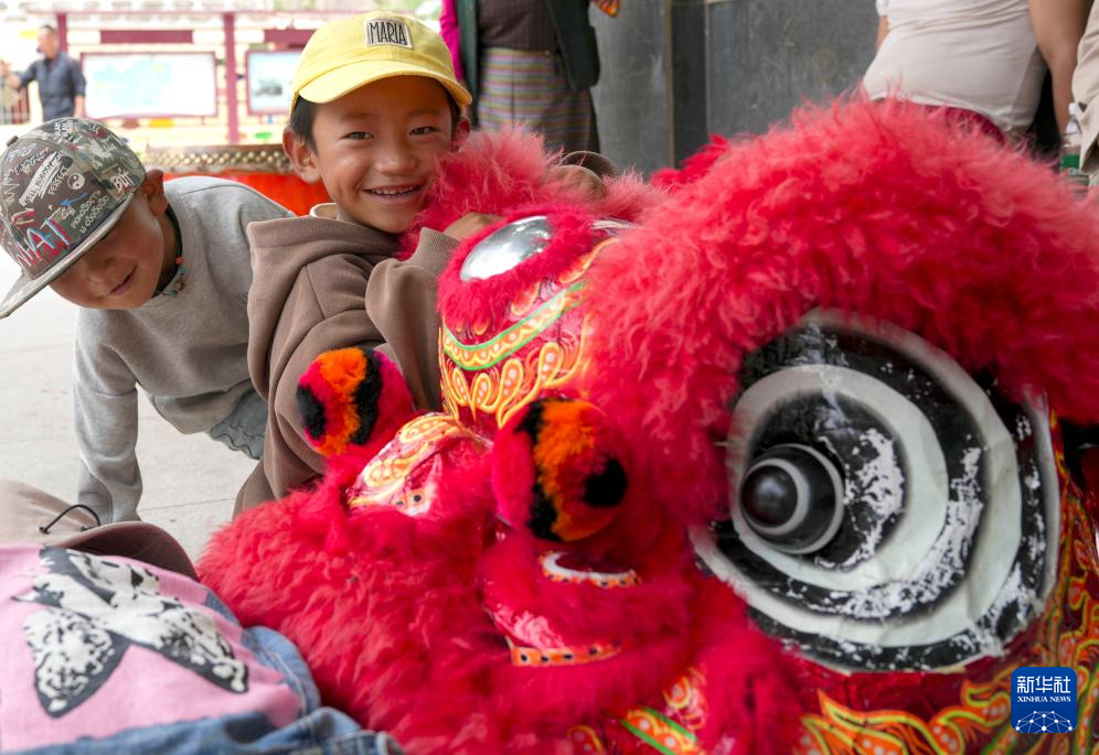 小朋友觀看碩督獅子舞的演出道具(7月21日攝)。新華社記者 晉美多吉 攝 ??