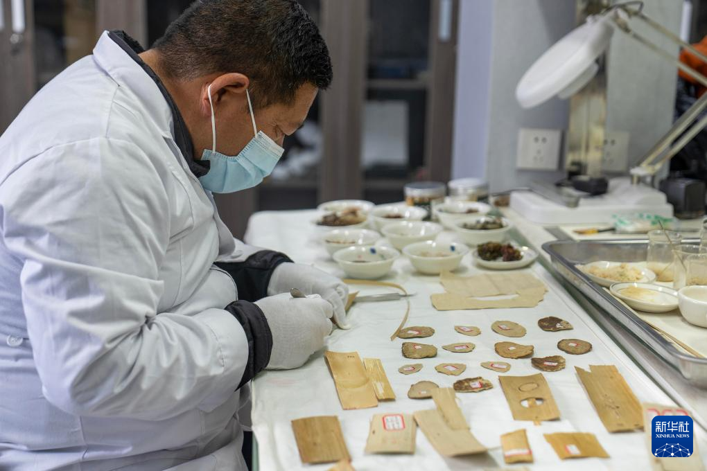 5月25日,布達(dá)拉宮貝葉經(jīng)實(shí)驗(yàn)性修復(fù)小組實(shí)驗(yàn)室工作人員在對(duì)貝葉進(jìn)行處理。新華社記者 旦增尼瑪曲珠 攝 ??