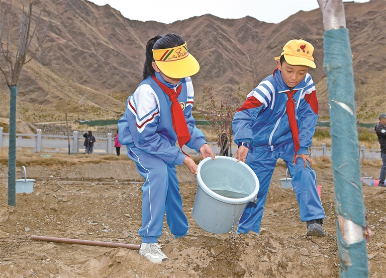 拉薩市第一小學學生在城關區(qū)慈覺林植樹點參加春日植樹活動。記者 潘多 洛桑 攝