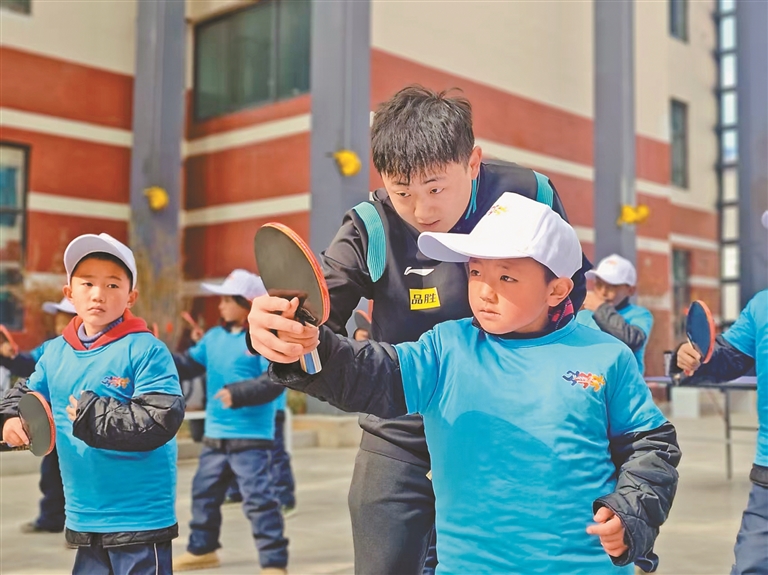 學生在教練員的指導下練習乒乓球揮拍動作。