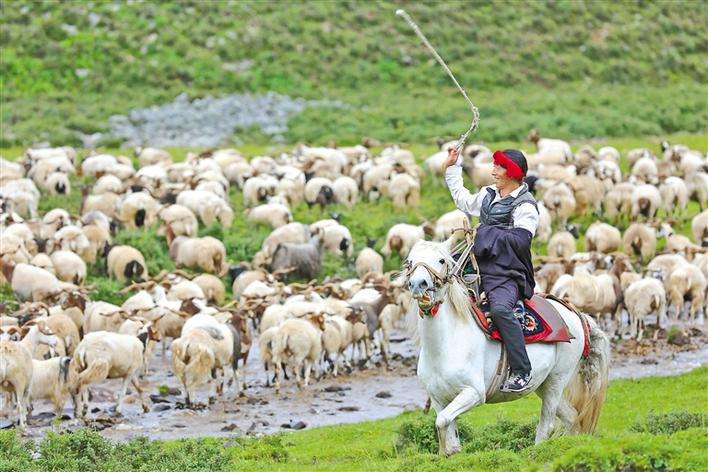2015年以來,貢覺縣引進(jìn)先進(jìn)養(yǎng)殖技術(shù),建立健全阿旺綿羊養(yǎng)殖繁育體系,實(shí)現(xiàn)了阿旺綿羊生產(chǎn)養(yǎng)殖規(guī)?;?、產(chǎn)業(yè)化,帶動(dòng)了農(nóng)牧民脫貧增收。 圖為貢覺縣阿旺鄉(xiāng)多熱村村民波澤正在放牧家里的阿旺綿羊。記者 陳志強(qiáng) 攝