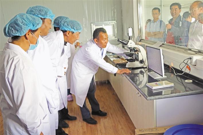 自治區(qū)農科院全國創(chuàng)新爭先獎章獲得者巴桑旺堆(中)向西藏農牧科技人員講解奶牛性控凍精技術。記者 李梅英 攝