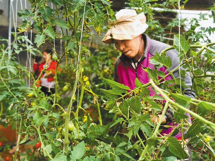 圖為丁青縣農(nóng)業(yè)生態(tài)產(chǎn)業(yè)園內(nèi)的工作人員在大棚里為西紅柿綁蔓。記者 周婷婷 攝