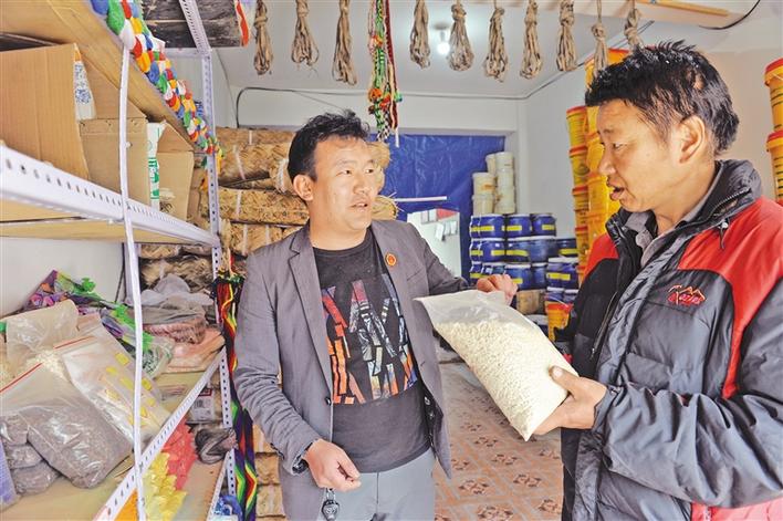 巴青縣雅安鎮(zhèn)產(chǎn)業(yè)合作社社員在給鎮(zhèn)黨委書(shū)記遲拉(左)介紹特色產(chǎn)品銷(xiāo)售情況。
