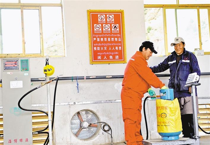比如縣江然村長(zhǎng)廊液化加氣站,61歲的致富帶頭人貢覺(jué)才培(左一),正在熟練地和工人給煤氣罐加氣。