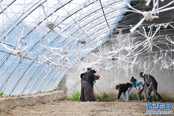 格桑旺姆(右三)與姐姐德吉卓瑪(右二)帶領工人在蔬菜大棚內(nèi)翻地,準備種新的蔬菜(8月3日攝)。