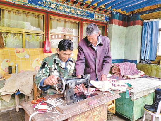 俊巴村的皮具制作于2008年被評(píng)定為自治區(qū)級(jí)非物質(zhì)文化遺產(chǎn)。圖為拉巴老人和兒子正在制作皮具。 拉薩融媒記者 莫瑞英攝