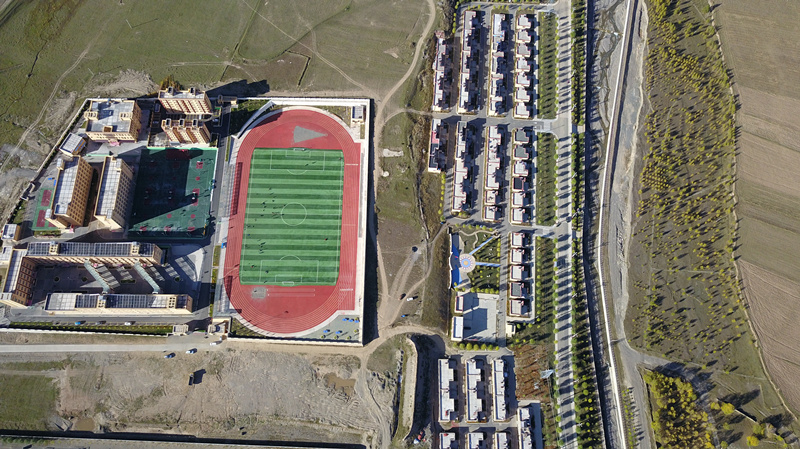 在甘孜州甘孜縣吉絨隆溝易地扶貧安置點,旁邊的十八軍窯洞遺址群展現(xiàn)著這里的紅色血脈。遠處雪山座座相連,不遠處縣城邊雅礱江河谷地帶,景色醉人。