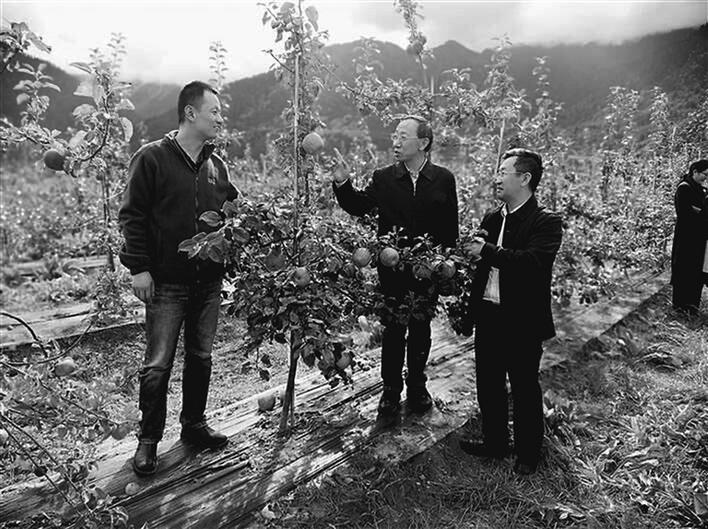 國家蘋果產業(yè)技術體系首席科學家霍學喜(中)在米林縣羌納蘋果示范基地現場開展技術指導。西藏日報記者 李梅英 攝