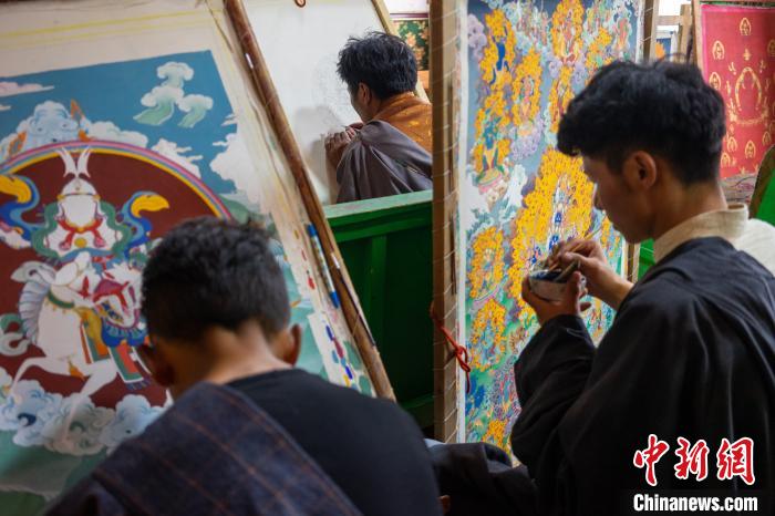 西藏昌都丁青縣象雄東朵唐卡畫(huà)派繪畫(huà)班的學(xué)員們學(xué)習(xí)唐卡繪制技藝。(資料圖) 江飛波 攝