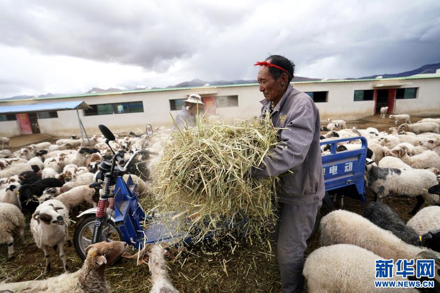 西藏日喀則市定日縣克瑪鄉(xiāng)幫布村村民頓珠在定日縣珠穆朗瑪崗巴羊規(guī)?;B(yǎng)殖產(chǎn)業(yè)園喂羊(7月31日攝)。頓珠2020年來到產(chǎn)業(yè)園打工,負責喂羊、打掃羊舍,每個月有3500元的收入。新華社記者 詹彥 攝