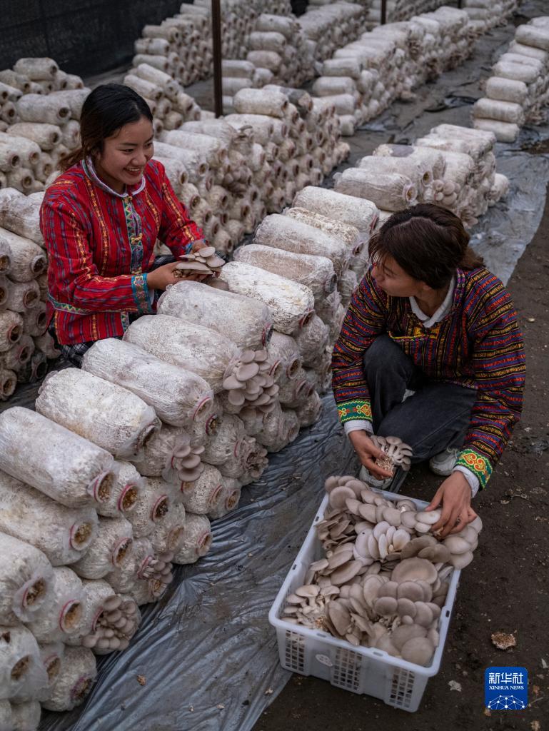 姐姐次仁拉珍(左)和妹妹明珠措姆在采摘平菇(4月14日攝)。
