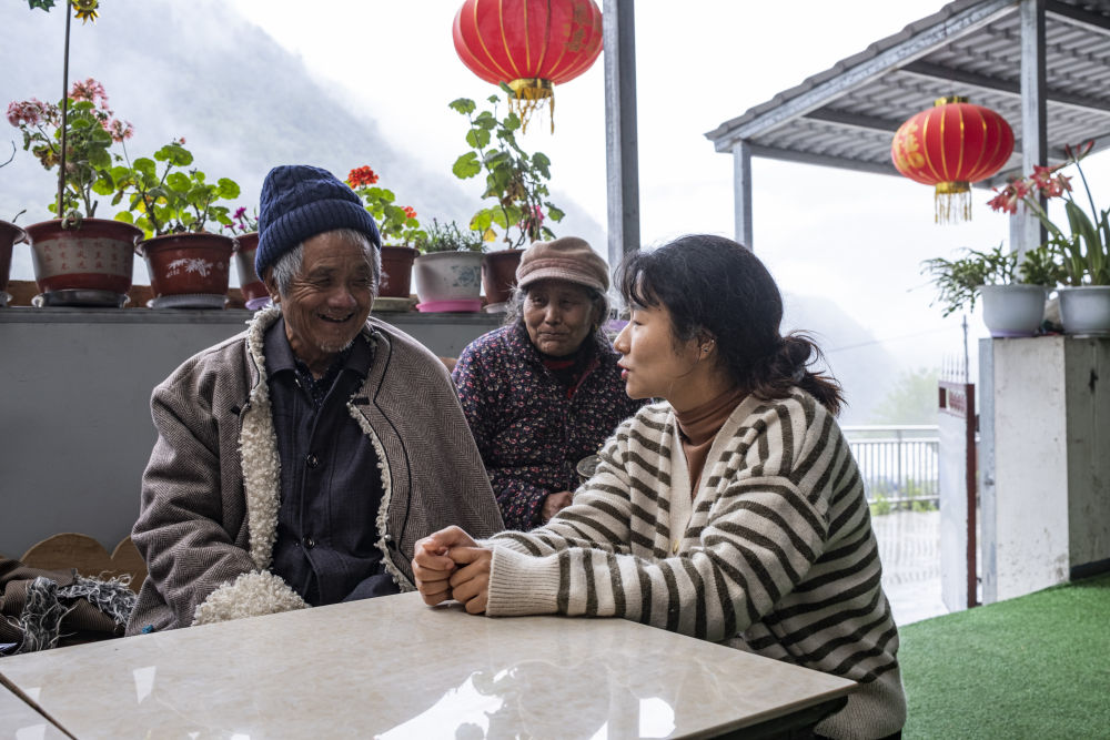 桑杰來坡與村干部聊天(4月15日攝)。新華社記者 孫非 攝
