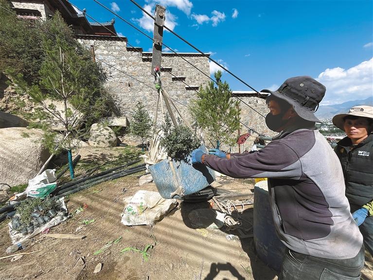 圖為拉薩北山造林的施工人員正在運(yùn)送樹苗。記者 次旺 攝