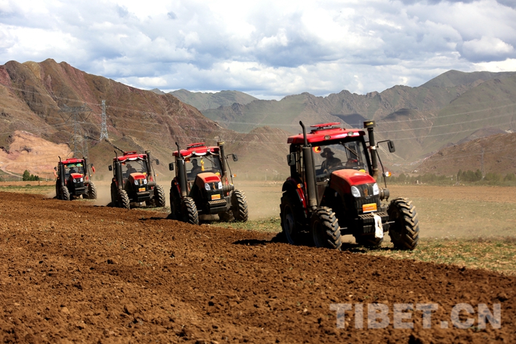 圖為在曲嘎強村四臺農(nóng)用機械聯(lián)合作業(yè)耕種飼草 攝影:王佳豪
