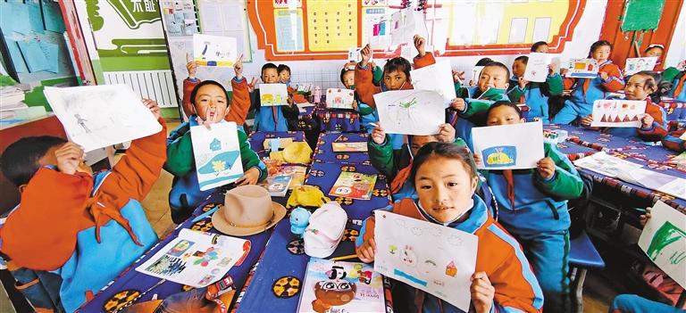 圖為那曲市小朋友展示他們參加“鄉(xiāng)村振興 那曲奮進(jìn)”活動(dòng)的作品。那曲采訪組 攝