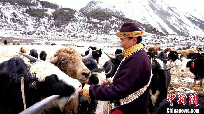 圖為角木那村民正在投喂牦牛。 巴桑曲扎 攝