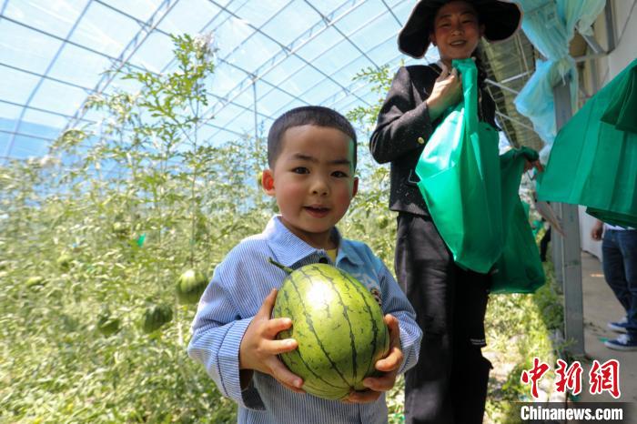 采摘節(jié)上,孩子們進入高原大棚采摘西瓜?!≈鬓k方供圖
