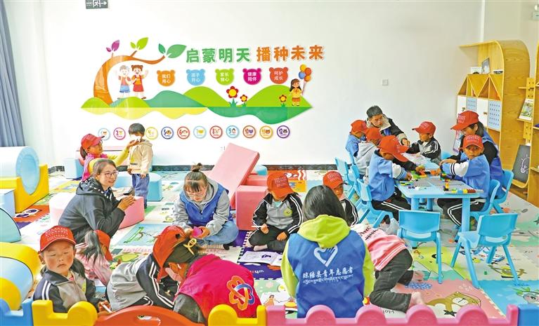 圖為志愿者陪伴瓊結(jié)縣加麻鄉(xiāng)昌嘎村兒童在該村日間照料中心婦幼兒童功能區(qū)玩耍。記者 劉楓 通訊員 熊起樊 攝