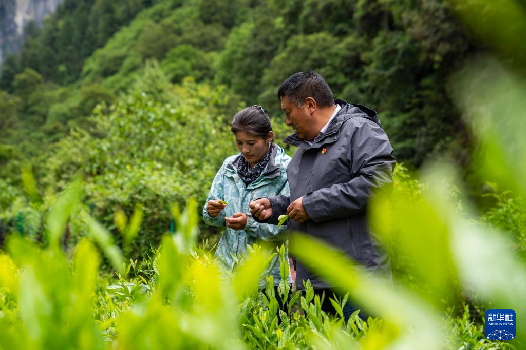 在勒門巴民族鄉(xiāng)的一處茶田,格桑旦增和女兒次仁旺姆正在查看茶葉生長(zhǎng)情況(2023年6月27日攝)。新華社記者 孫非 攝