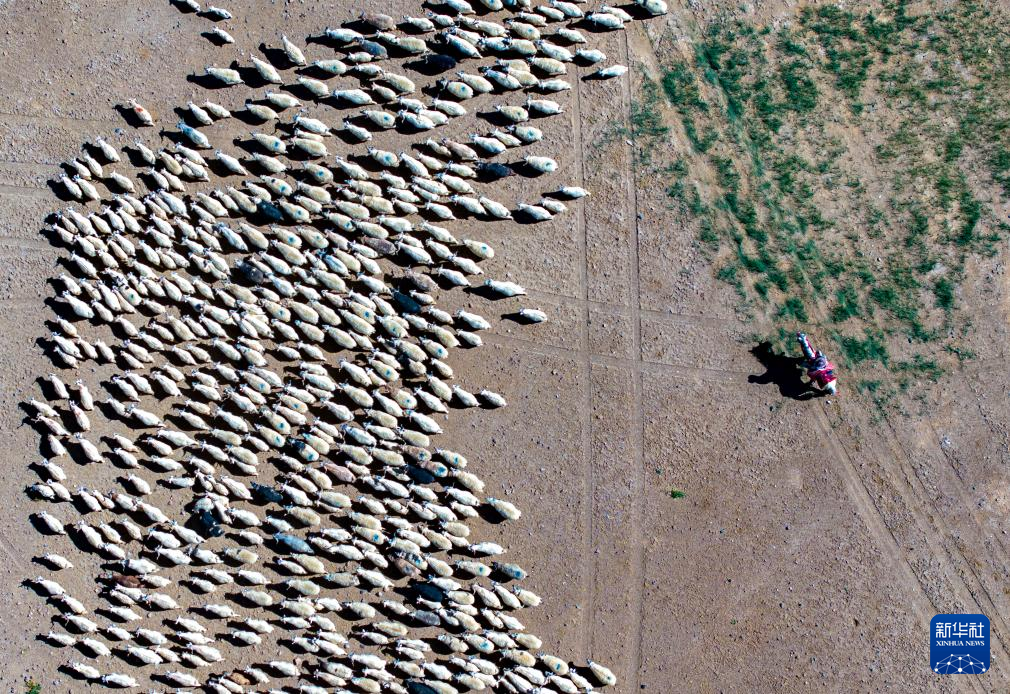 牧民在阿里地區(qū)日土縣班公湖畔放牧白絨山羊(無人機照片,9月21日攝)。新華社記者 姜帆 攝