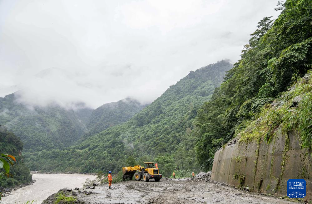 在墨脫縣格當(dāng)鄉(xiāng),工作人員在搶通道路(2023年10月12日攝)。新華社記者 孫非 攝