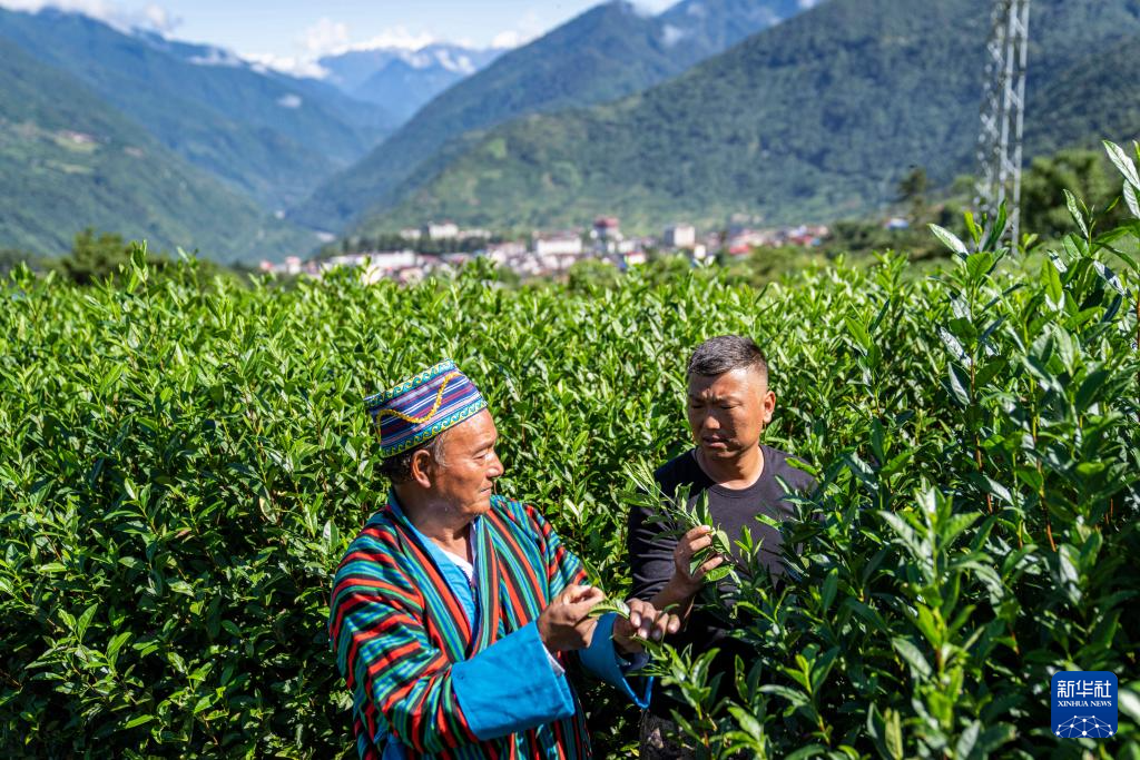墨脫村村委會(huì)副主任達(dá)瓦次仁(右)查看茶葉生長情況(2023年10月13日攝)。新華社記者 孫非 攝