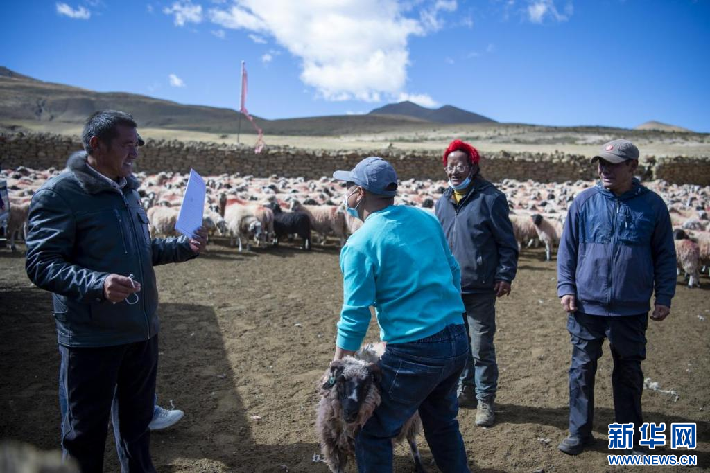 扎西松多村黨支部工作人員與商戶(hù)交易。新華網(wǎng) 旦增努布 攝