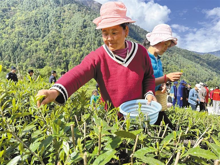 在墨脫縣格當鄉(xiāng)德吉村,茶農在采摘春茶。王凱 記者 王敏 攝