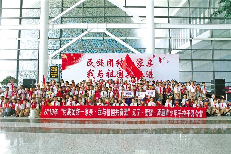 2019年“民族團(tuán)結(jié)一家親·我與祖國(guó)共奮進(jìn)”遼寧·新疆·西藏青少年手拉手夏令營(yíng)開(kāi)營(yíng)儀式現(xiàn)場(chǎng)。