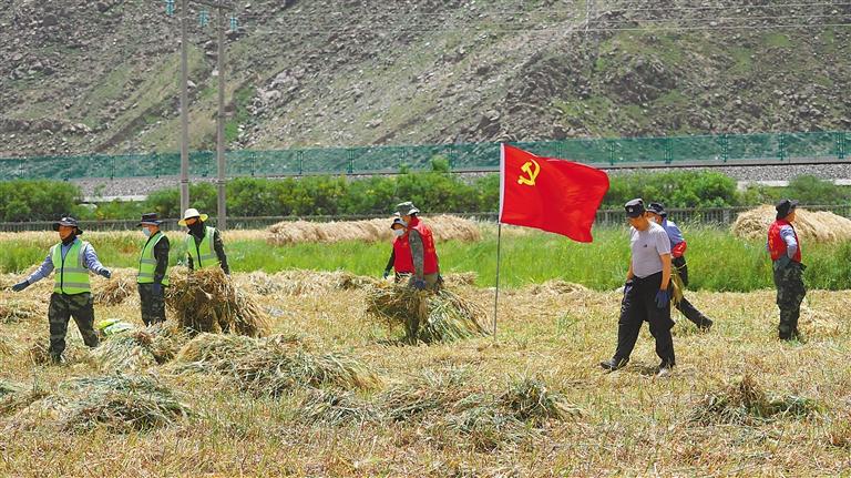 圖為拉薩市堆龍德慶區(qū)古榮護路大隊志愿服務分隊深入田間地頭,幫助農(nóng)民收割青稞。