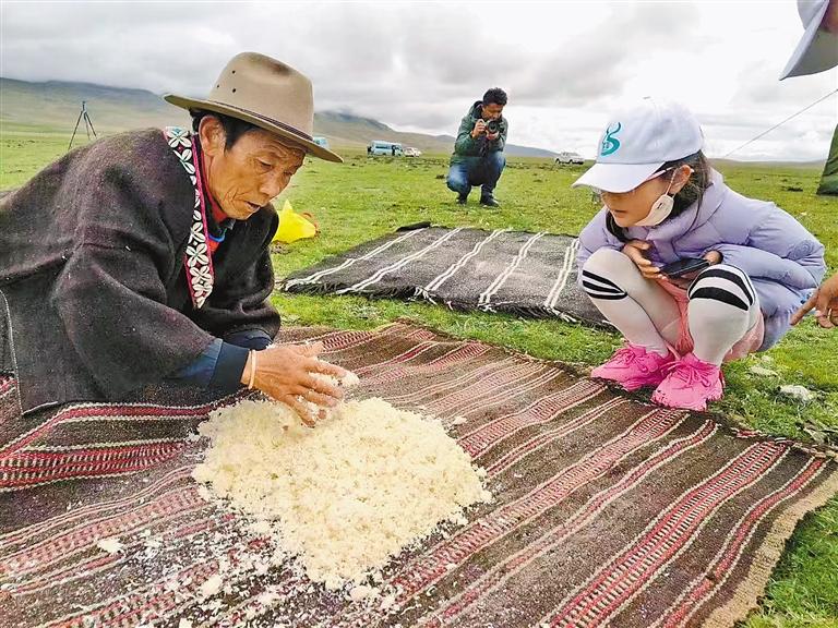 圖為游客在瑪如村觀看當?shù)啬撩裰谱髂淘?。記?丹增平措 攝